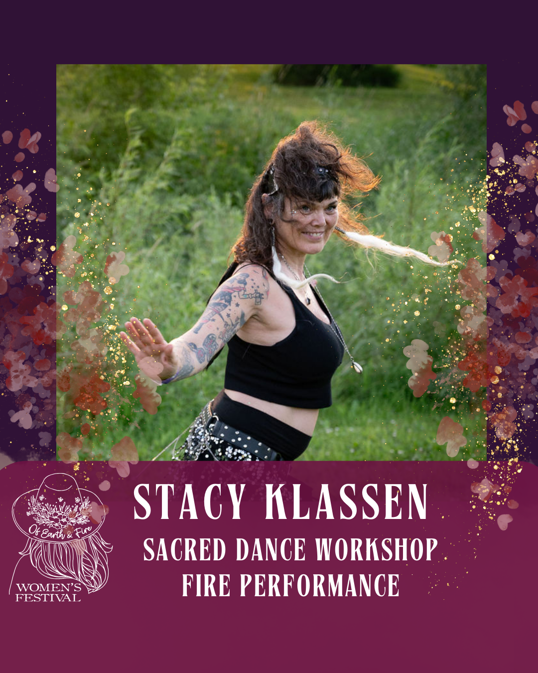 Join Stacy Klassen for a dual offering of movement magic and fire medicine. Her Sacred Temple Dance guides women into deep embodiment through intuitive movement and ritual — a journey of reconnection with body, magic, and divine feminine essence. Her Fire Dance Performance is a breathtaking invocation of transformation, dancing with living flame as prayer and art. An alchemical experience of beauty, power, and sacred remembrance.